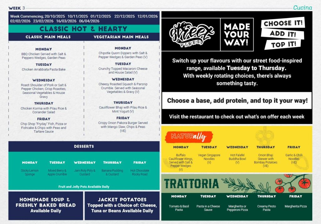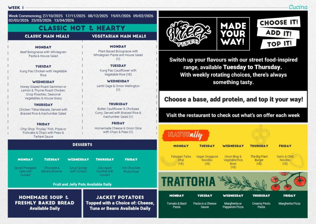 We work in partnership with our caterers, Cucina to deliver a high-quality food service that offers a range of options that are both healthy and appealing to students and staff, and great value for parents and carers. Our meal deal options are priced at £2.70.