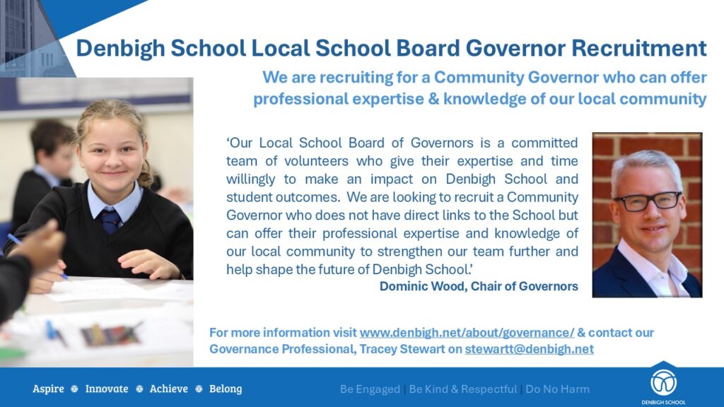 The Chair of Governors, Dominic Wood can be contacted c/o Denbigh School, Burchard Crescent, Shenley Brook End, Milton Keynes MK5 6EX