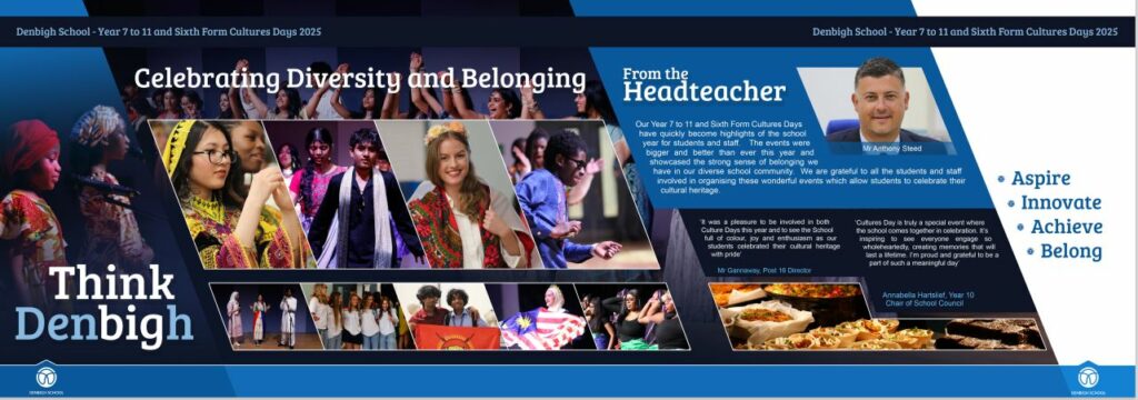 Our Year 7 to 11 and Sixth Form Cultures Days when we come together to celebrate our cultural heritage have quickly become highlights of the school year for students and staff. The events were bigger and better than ever this year and showcased the strong sense of belonging we have in our diverse school community. Our Think Denbigh Flyer has pictures from our two wonderful days.