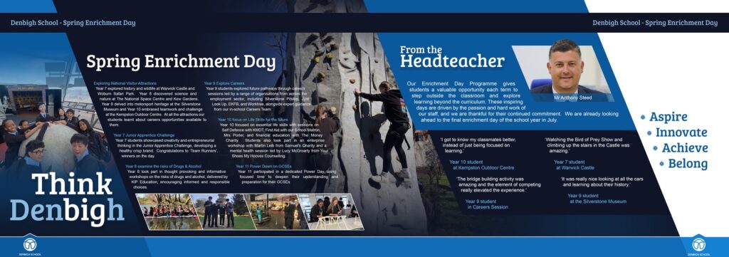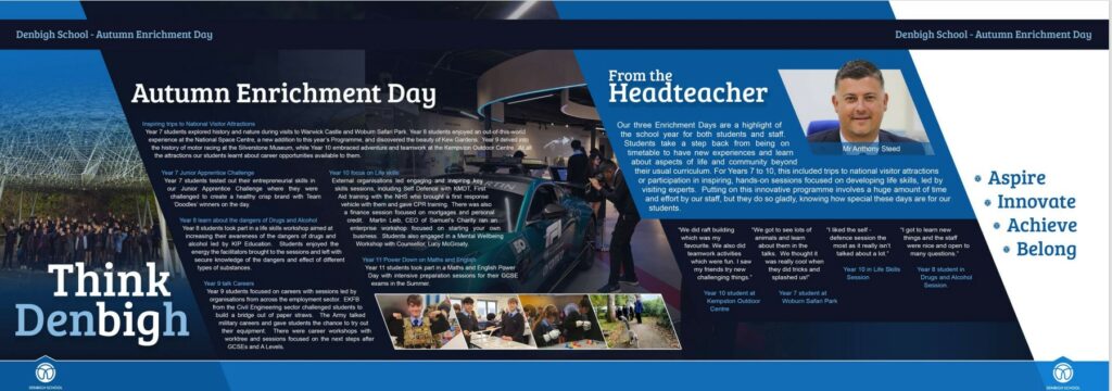 Our Enrichment Day Programme allows students to come off timetable for three days over the year to look beyond the curriculum, learn new life skills, plan for their future and experience local and national visitor attractions. Our 2025 Autumn Term Enrichment Day allowed Years 7 to 10 to join a trip to a national visitor attraction, or take part in sessions focused on developing key life skills led by visiting experts. Year 11 students took part in a Maths and English Power Day with intensive preparation sessions for their GCSE exams in the Summer.