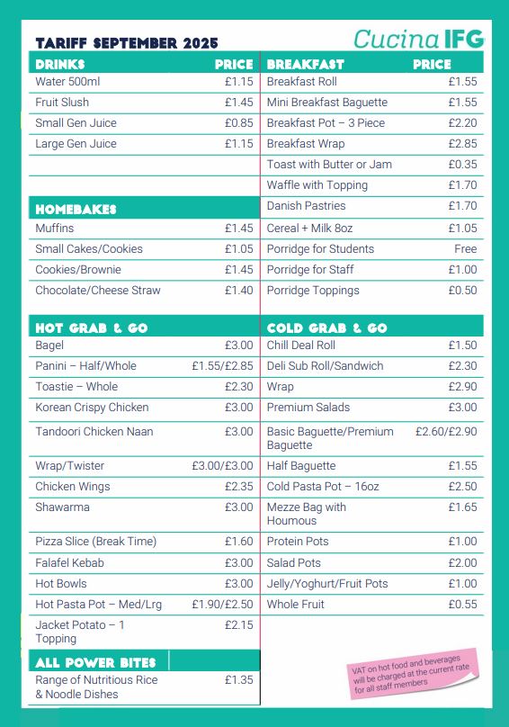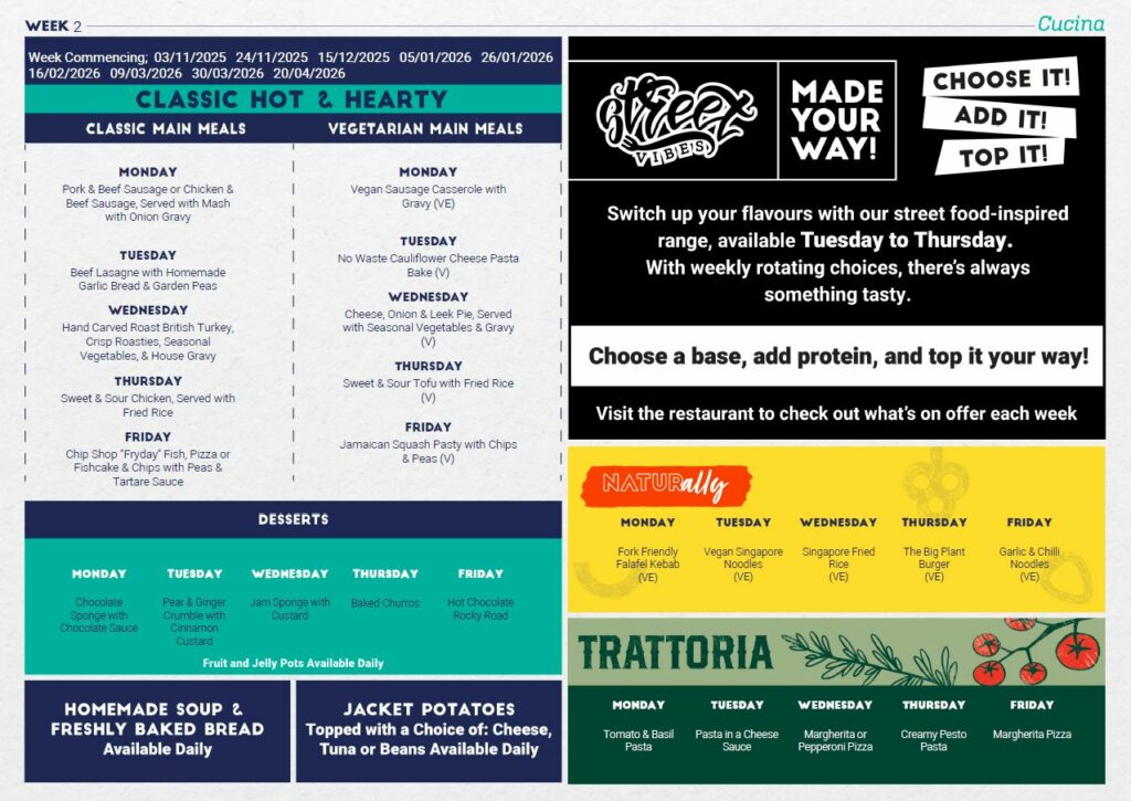 We work in partnership with our caterers, Cucina to deliver a high-quality food service that offers a range of options that are both healthy and appealing to students and staff, and great value for parents and carers.  Our meal deal options are priced at £2.70.