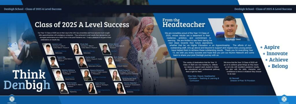 Please click on the link to the DfE performance tables for details of Denbigh School’s examination results.